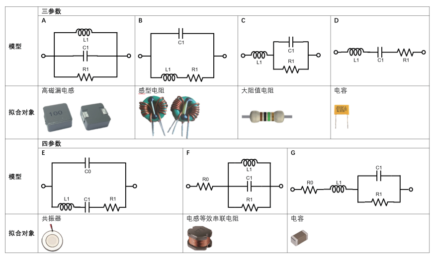 现实生活中不同类型的器件可以被等效成简单的三参数四种模型、四参数三种模型的阻抗器件,等效电路分析测试功能提供了7种基本的电路模型用于等效这些器件。